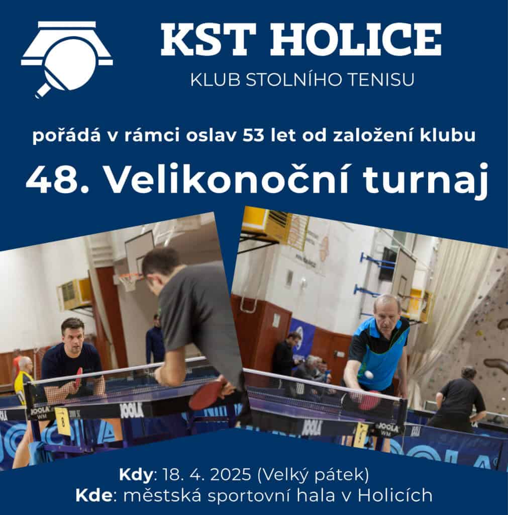 Klub stolního tenisu KST Holice pořádá v rámci oslav 53 let od založení klubu Velikonoční turnaj. 18.4.2025 (Velký pátek) Všichni jste srdečně zváni a těšíme se na vás :-)